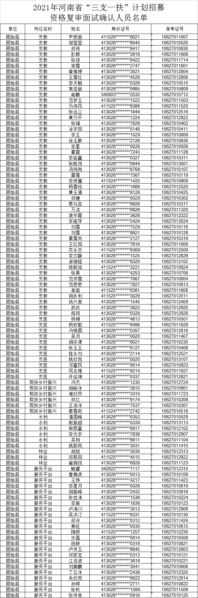 原文标题:关于2021年河南省“三支一扶”计划招募资格复审面试确认人员名单的公告